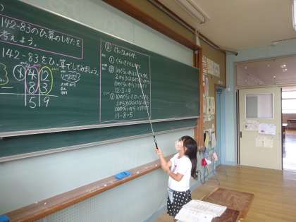 算数科「たし算とひき算のひっ算(2)」の学習をしています。今日は、ひき算のひっ算のしかたをみんなで考えました。前に出てみんなに計算のしかたを説明したり、みんなの前で問題を解いたり、みんなで考えることができました。