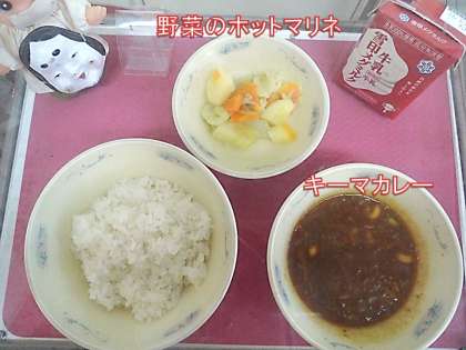 今日の献立は、「ごはん・牛乳・キーマカレー・野菜のホットマリネ」でした。