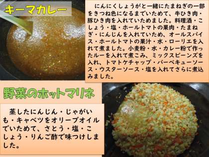 野菜のホットマリネは、蒸したじゃがいも・にんじん・キャベツをオリーブオイルでいためて、さとう・塩・こしょう・りんご酢で味つけしました。りんご酢のまろやかな酸味が、さっぱりとしてキーマカレーとよく合います。酢を入れて加熱するので、さらにまろやかになります。暑い時期にもぴったりです。酸っぱい味が苦手な子もいますが、みんなしっかり食べていました。こちらもほぼ完食でした