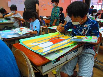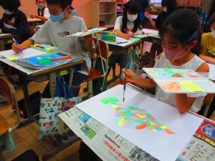 5年生の図画工作科では「お話の絵」に取り組んでいます。今年は、「まほろばトリップ」と「エヴィーの秘密の消えた動物たち」と「しずかな魔女」という3つのお話を聞いて、心に残った場面を想像を広げながら描いていきました。各クラス色を付け始めました。これから物語を聞いて想像した世界が、どのような作品になるか楽しみです