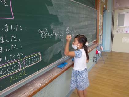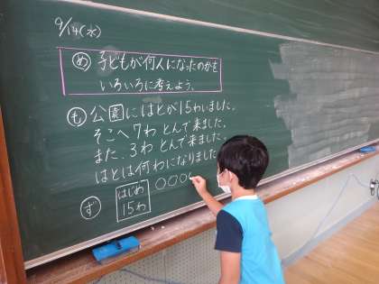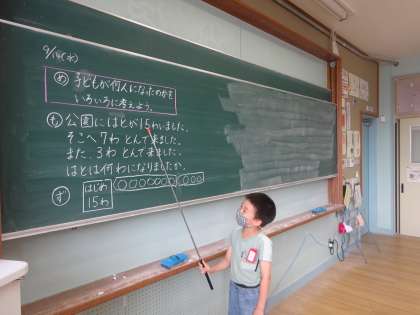 算数科「図をつかって考えよう」の学習では、子どもたち同士で学び合う場をたくさん取り入れています。自分たちで図を書いて、考え、立式し、伝え合います。友だちの考えに自分の考えをつけ足したり、友だちの書いた式をもとに説明したり、考えを広げる姿がたくさん見られます。
