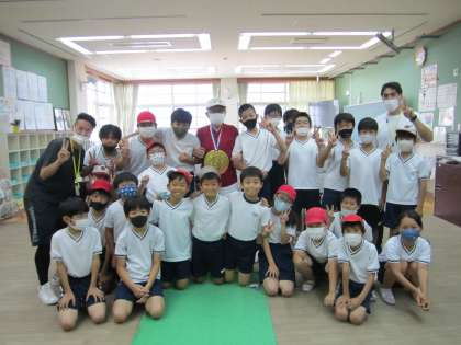 本校のクラブ活動「ゲートボールクラブ」でお世話になっている鈴木信之京都府ゲートボール連合会長様が令和4年の春の叙勲・褒章受章者に選出され、旭日双光章を受章されました。ゲートボールの普及に努められて40年、ゲートボールのクラブ活動を推進されてきました。本校でも長い間お世話になっており、ゲートボールクラブは大変人気のあるクラブとなっています。高倉小学校としても日頃の感謝を込めて、お祝いをしたいと考えました。一人一人がメッセージを書き、金メダルの色紙をお渡ししました。記念の集合写真では、みんなの笑顔で温かい雰囲気に包まれました。改めまして、鈴木会長様おめでとうございます。今後ともご指導の程よろしくお願い致します。