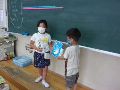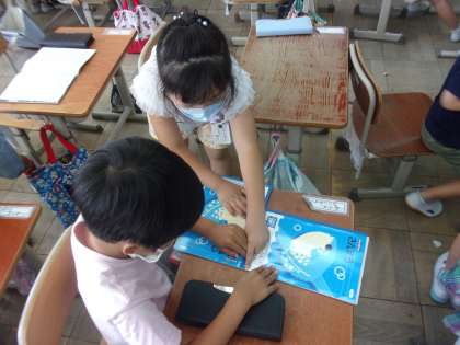 「おおきさくらべ(1)」の学習で、どちらが長いか比べ方を考えました。