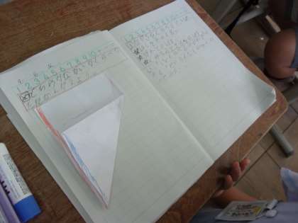 鉛筆やひもの長さ比べをしたり、ノートやはがきの縦と横の長さを比べる方法を考えたりしました。正しく長さを比べるには、「はしをそろえる」「ピンとのばす」「比べるところを重ねる」ことが大事だと気づきました。