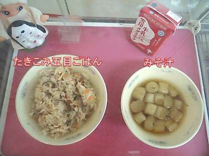 今日の献立は、「たきこみ五目ごはん、牛乳、みそ汁」でした。