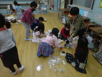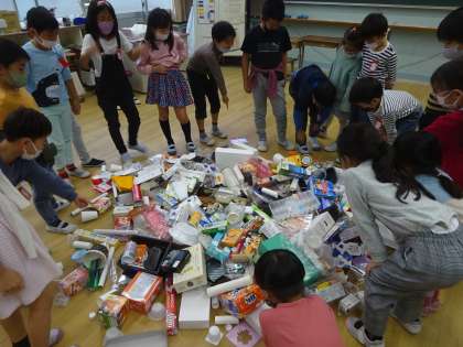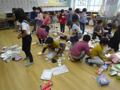 生活科「あそんでためしてくふうして」の学習が始まりました。みんなで持ち寄った材料を、今日は1つに集めました。「すごい!たくさんあるね!」「だけど、何がどこにあるのかわからないよ。」「みんなで仲間分けしよう。」など話し合い、集めた材料をみんなで協力して、大きさ、形、種類などで仲間分けしました。