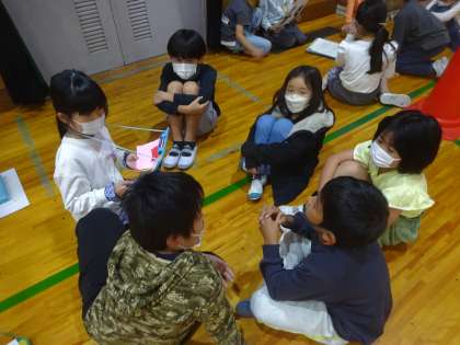 1・2・3年生による、たてわり遠足に向けての顔合わせをしました。小グループに分かれて、自己紹介、仲良くなるための遊び、遠足当日の遊び決めをしました。どのグループも3年生が中心となって、進行をしてくれました。