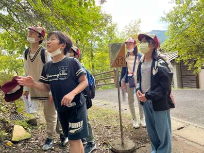 大自然の中を、班でスコアオリエンテーリングをしています。