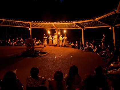 楽しみにしていたキャンプファイヤーの時間です。山の女神様から友情の火、信頼の火、希望の火、感謝の火をいただき、火の精霊たちが点火をしました。美しい炎が花脊の夜空に舞い上がり、子どもたちの気持ちも盛り上がりました。