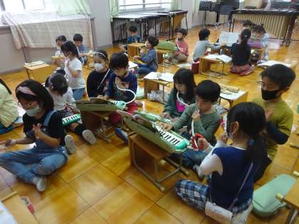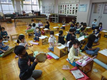 音楽科「リズムをかさねて楽しもう」で、けんばんハーモニカとリズムをかさねて演奏しました。けんばんハーモニカの旋律と、打楽器のリズムが合わさると、「リズムが助けてくれたから、けんばんハーモニカが弾きやすかったよ。」「けんばんハーモニカが助けてくれたから、リズムを打ちやすかった。」など、嬉しそうな声が聞こえてきました。