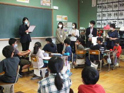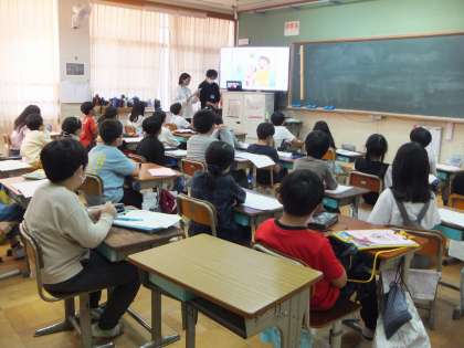 3、4時間目に引き続き、5、6時間目には、認知症のサポーターをしている方々から直接お話をしていただきました。5時間目は、認知症という病気について、専門的な内容を医師の先生より講義していただきました。子どもたちは真剣な様子で聞き、疑問に思ったことは積極的に質問をするなど、認知症の理解に努めていました。「認知症」という言葉は聞いたことがあっても、どんな症状が出るのか分からなかった子どもたちも、絵本の読み聞かせやスライドを見ながらくわしく知ることができました。