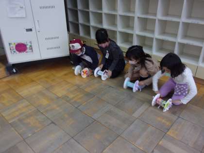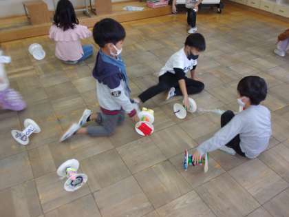 出来上がった「かみざらコロコロ」を転がして、みんなで遊びました。
