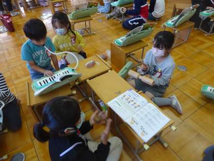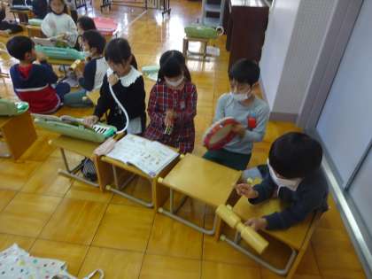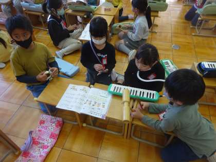 音楽科「リズムをかさねてたのしもう」で、発表会に向けての練習が始まっています。グループに分かれて、担当の楽器を決めて練習です。どのグループも話し合いをしながら、一生懸命取り組む姿が印象的でした。