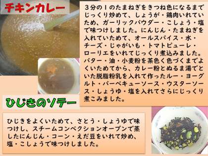 ひじきのソテーは、ひじきをよくいためて磯のにおいをとばしてから、さとう・しょうゆで味つけしました。スチームコンベクションオーブンで蒸したにんじん・コーン・えだ豆をいれて炒め、塩・こしょうで味つけしています。ひじきを使った献立は、子ども達に人気です。コーンや枝豆のあまみもあり、こちらも喜んでおいしそうに食べていました。ごはんも、おかずもほぼ完食でした。