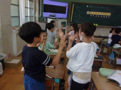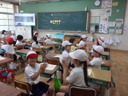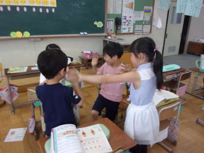 音楽では、「はしの上で」や「たぬきのたいこ」の歌に合わせて拍のまとまりを感じとる学習をしました。「ひざを打ったり手を打ったりすると2拍子の音楽に合った感じになったよ。 」「友達と一緒に合わせると楽しいね。」など、音楽に合わせて、手遊びをしたり体を動かしたりながら2拍子と3拍子の拍のまとまりの違いを感じとっていました。