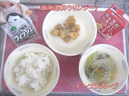 今日の献立は、「ごはん・牛乳・油淋鶏(ヨウリンジー)・ビーフンスープ・じゃこ」でした。