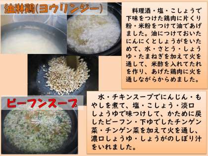 油淋鶏(ヨウリンジー)は中国の料理の一つで、日本語では「鶏肉に油をかけて揚げた料理」となるそうです。揚げた鶏肉に細かく刻んだネギなどの入った甘辛いたれをかけて食べます。給食では、油ににんにく・しょうがで香りををつけて、水・さとう・しょうゆ・たまねぎを入れて火を通して、米酢を入れて作ったたれを米粉・かたくり粉をつけてあげた鶏肉に火を通しながらからめました。にんにく・しょうがの風味のきいた甘辛いたれがからんでごはんによく合い、子どもたちにも大人気でした。