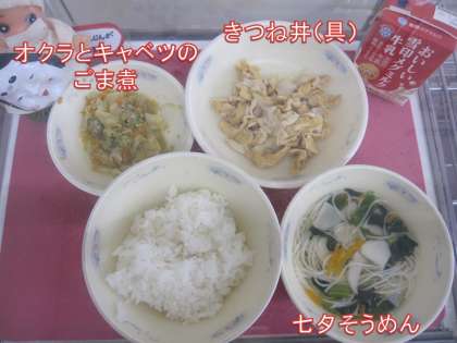 今日の献立は、「ごはん・牛乳・きつね丼(具)・オクラとキャベツのごま煮・七夕そうめん」でした。今日は七夕です。給食でも七夕の行事献立でした。