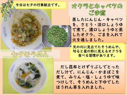 七夕そうめんのそうめんも、七夕に食べる習慣があります。昔に中国から伝わった習慣のようです。今日の七夕そうめんは、だし昆布とけずりぶしでとっただし汁ににんじん・かまぼこそうめん・ほうれん草をいれました。味つけはみりん・塩・しょうゆでしています。