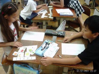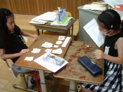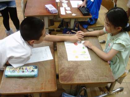 英語の学習では、「スペシャルプレゼント」を作ろうをめあてに取り組んでいます。今日はお店屋さん役とお客さん役に分かれて、英語で野菜を買うやりとりをしました。みんなそれぞれのサラダボウルが出来上がり素敵な「スペシャルプレゼント」が完成しました。