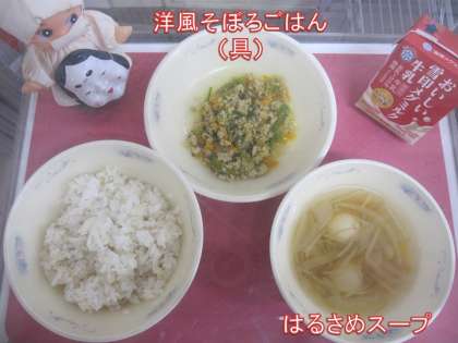 今日の献立は、「麦ごはん・牛乳・洋風そぼろごはん(具)・はるさめスープ」でした。