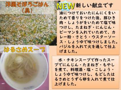 洋風そぼろごはんは新しい献立です。にんにく・しょうがと一緒に、豚ひき肉・たまねぎ・にんじん・ピーマンをいためて、塩・カレー粉・さとう・ウスターソース・しょうゆ・バジルで味つけしました。子どもたちが自分でごはんにのせて食べます。カレー粉やバジルの風味がきいたそぼろごはんです。子どもたりは全部のせたり、少しずつのせたりとそれぞれ楽しみながら食べていました。「ごはんに合っておいしかった。」「ピーマン苦手だけど、これだとおいしく食べられた。」と喜んで食べていました。