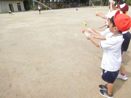 水を遠くに飛ばす競争をしたり、砂場で川を作ったり、乾いた運動場に水で絵を描いたり・・・