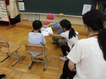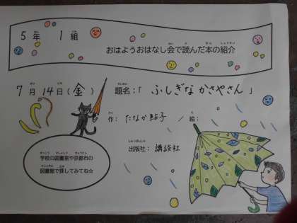 7月14日(金)の朝読書の時間に、5・6年生・こじか学級の各教室で『おはようおはなし会』が行われました。科学読み物や絵本などが準備され、高学年の子どもたちも本に集中するようにみんなお話に聞き入っていました。こじか学級では、子どもたちと会話を楽しみながら読み聞かせが行われていました。