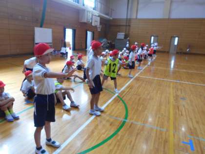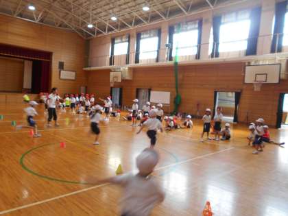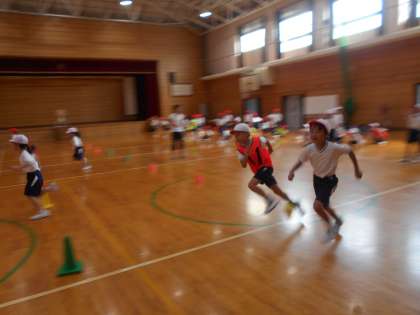 6人チームに分かれて、折り返しリレーをしました。チーム内でどんな順番になるか、どのように走れば速く走れるのかを、みんなで考えながら学習を進めました。ジグザグリレーをしたときには、「小回りに回ったら速く走れるよ」「体をななめにして回ったら速く回れたよ」など、うまく走るコツを考えることができました。