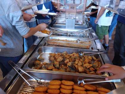 花背山の家での初めての食事です。みんなとても楽しみにしていた、バイキング形式です。事前に学習したバイキングのマナーをふりかえりながら、みんなで楽しく食べています。