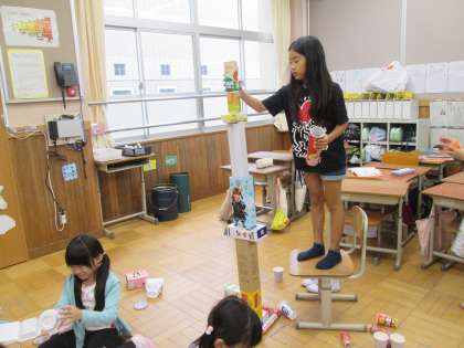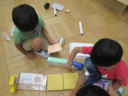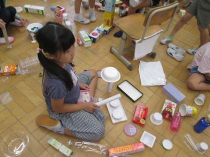 生活科「あそんで ためして くふうして」では廃材を使って学習しています。それぞれの廃材の特徴をいかしてできるあそびを考えています。今日はたくさんの廃材に触れ「こんなもの作れたらいいな〜」の気持ちが沸き上がりました。