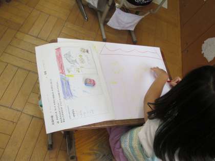 ことばのかたちの学習では、お話を聞いて想像したことを絵にしています。一つの本でもみんなそれぞれの絵が出来上がっていくのが楽しいです。