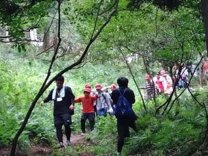 頂上でお弁当を食べた後は、下山です。「足をすべらさないように気をつけよう。」「あと少し。がんばって!」など、お互いを励まし合いながら進みます。