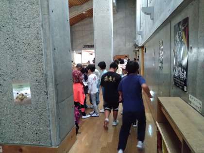 天候のため、アスレチックから館内ラインオリエンテーリングに変更になりました。グループに分かれて、館内を巡って暗号を見つけ出します。
