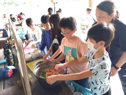 最終日、最後の活動は2度目の野外炊事です。すき焼き風煮を作ります。1日目の経験を生かして、みんなの手際もよくなっています。
