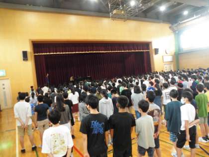 9月20日(水)に京都コンサートホールで行われるOikeフェスティバル合唱の部に向けて、3小学校合同の1回目の合唱リハーサルがありました。3小学校で歌声を合わせるのは6年生になって初めてのことでした。3小学校の6年生が集まると、その人数は300人以上にもなります。合唱の部で歌う曲は、学年合唱『ほらね、』、全校合唱『翼をください』、京都御池中学校校歌の3曲です。本日初めて3小学校で合唱を合わせてみましたが、初めてとは思えないほどの完成度で300人が歌う歌声は圧巻でした。これまで各クラスで音楽の時間に練習してきた成果が出ていたリハーサルでした。