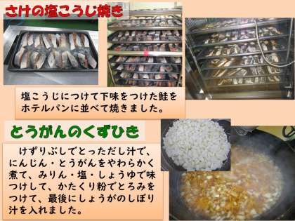 さけの塩こうじ焼きは塩こうじで下味をつけた鮭をスチームコンベクションオーブンでふっくらと、また、皮にこんがりと焼き目がつくように焼きました。塩こうじだけで味をつけているので、やさしい味つけですが、ごはんによく合い子どもたちにも大人気でした。「皮がパリパリでおいしい。」と、皮ごと食べていました。
