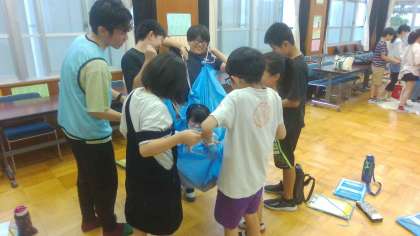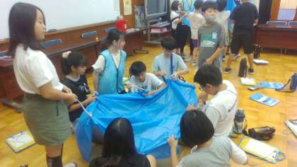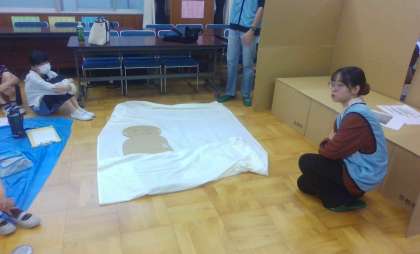 「てるてる担架」グループでは、非常時のダンボールベットの紹介や、ブルーシートを使って作る「てるてる担架」の作り方を教えていただきました。作った「てるてる担架」に、実際に人を乗せて持ち上げることを体験することができた子どもたちもいました。