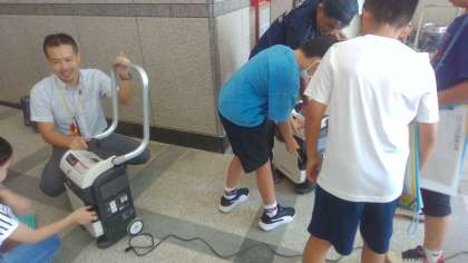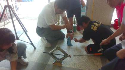 「発電機」グループでは、非常時に使用する発電機を実際に動かして、電灯に明かりを灯す体験や、非常時に使用するジャッキの使い方などを体験することができました。発電機を動かして喜ぶ姿や、ジャッキで自分たちの身体が簡単に持ち上がる様子に驚く姿が印象的でした。