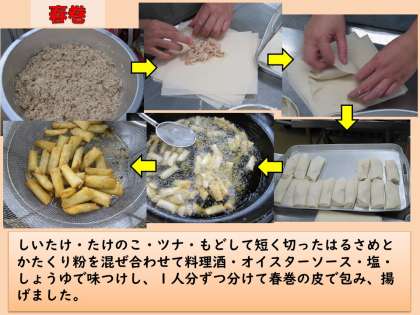 今日一番の人気は春巻。給食を取りに来た当番さんは「今日は春巻だ。」と楽しみにしてくれ、教室でも声をかける前から「春巻おいしい!」「パリパリでおいしい。」「もっと食べたい。」とたくさん感想を教えてくれました。給食の揚げ物は給食室で手作りしています。今日の春巻ももちろん手作りです。しいたけ・たけのこ・ツナ・はるさめ・かたくり粉・料理酒・オイスターソース・塩・しょうゆで具を作り皮に1人分ずつ乗せて巻いて揚げました。