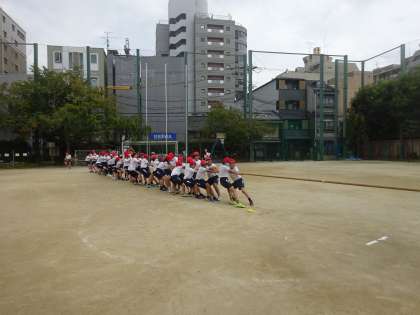 運動交流会では、5・6年生による交流競技があります。タイトルの「みんなの力、ツナげていこう〜高倉を引っ張れ!!〜」にもあるように、競技は綱引きです。今日は練習でしたが、運動場の真ん中に置かれた綱を挟んで座る5・6年生の姿は緊張感もあり、「さすが高学年」と思わせる様子でした。