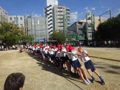今年度からの取組である、6年生との交流競技「みんなの力、ツナげていこう〜高倉を引っ張れ!!〜」では、3つのグループに分かれて、5・6年生が力を合わせて真剣勝負をしました。