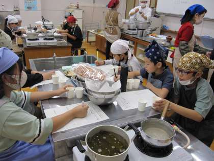 本日もゲストティーチャーとして、「京料理かじ」店主の梶憲司様をお招きし、「五感を生かして『だし』のうま味を味わい、『だし』を生かした料理をつくろう」というめあてで調理実習を行いました。「だし」のうま味を生かした調理の方法を知ったり、プロの料理人の技を間近で見たりすることができ、日本料理のよさについて思いを深めることができました。「五感で料理を味わうことを体験できてよかったです。」「プロの料理人の技を目の前で見ることができました。」など、子どもたちの心に深く残る体験となりました。