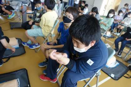 実際にAEDの使い方や胸骨圧迫の基本技術を教わり、実技体験を行いました。知らないことばかりではありましたが、命に関わる大切なことを多く学び、身に付けることができました。あっという間に終わり、子どもたちは『知らないことばかりだったけれど、もしものときに、力になれるようにしたいと思います。』『命を助けられる行動をとっていきたいです。』と多くの気づきに出合うことができていました。