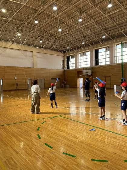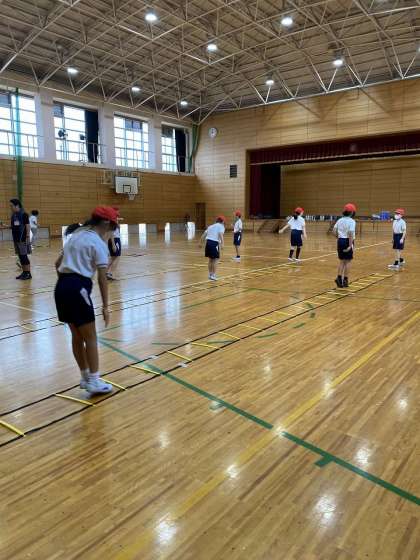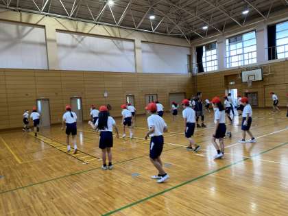昨日はスマイル体力向上部会の吉益さんをはじめ、たくさんの方にお世話になり、体力向上の取組を行いました。最初にラダートレーニングを行いました。子ども達は、普段はやらないような動きに苦戦しながらも、頑張ってステップを行いました。