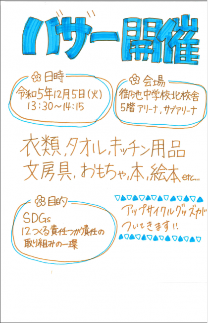 京都御池中学校では、8年生がSDGs「つくる責任・つかう責任」の学習の一環として、バザーを開催されるようです。今日は、高倉小学校にバザーの開催をお知らせするポスターが届きました。