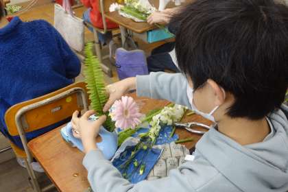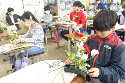 本日生け花体験を行いました。5年生がおもてなしの気持ちをもって生け花を行い、校舎内に飾りました。きれいなお花たちがたくさんの人たちの心を癒しています。喜んでもらえるといいですね。