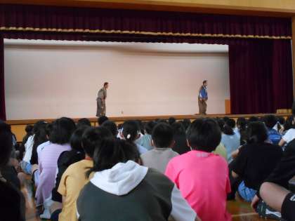 今日の3・4時間に高倉小・御所南小・御所東小3校の6年生合同で、狂言鑑賞がありました。講師の小笠原由祠様と泉愼也様にお越しいただき、「痺(しびり)」という演目を披露していただきました。