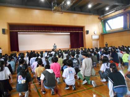 狂言鑑賞の後には、狂言での「笑い」や「泣く」等の演技の仕方を教わりました。600年以上の歴史があることや、講師の方々が演じられている時の声の出し方などを見て、たくさんの子ども達が狂言のことをもっと知りたいという思いをもちました。