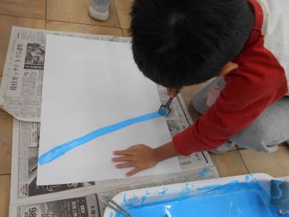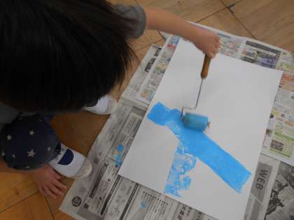 今日は、ローラーを使って二枚の画用紙に色をぬりました。初めて使う子どもたちもおり、ローラーがコロコロまわりながら色がついていく様子がとても楽しかったようです。